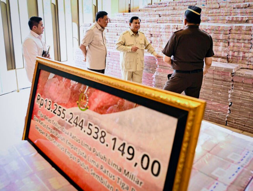 Presiden Prabowo Subianto menyaksikan secara langsung penyerahan uang pengganti kerugian negara sebesar Rp13.255.244.538.149,00 dalam perkara tindak pidana korupsi pemberian fasilitas ekspor Crude Palm Oil (CPO) dan turunannya, dari Kejaksaan Agung kepada Kementerian Keuangan di Gedung Utama Kompleks Kejaksaan Agung RI, Jakarta, pada Senin, 20 Oktober 2025. (Foto: BPMI Setpres)